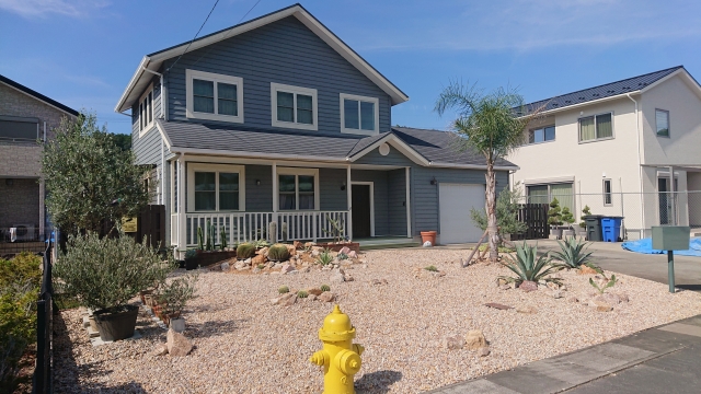 ロックガーデンのあるおうち。黄色の消火栓がよいアクセントになっています。